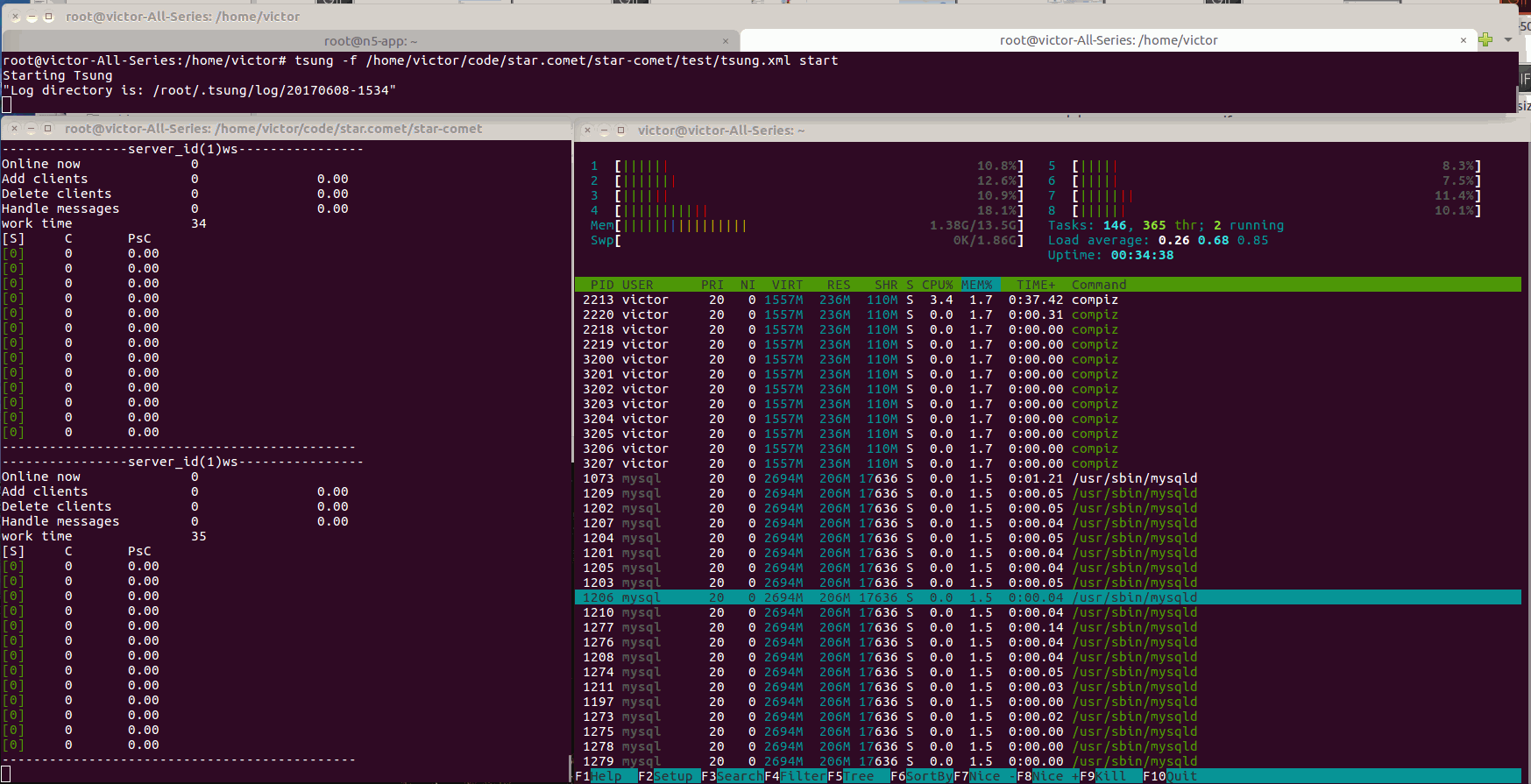 Gif анимация процесса тестирования. Видно что идёт прирост около 2500 соеденений в секунду и то что все ядра загружаются почти равномерно. Так же виден рост потребления памяти.